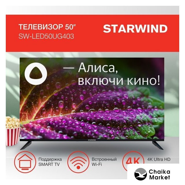 50" 3840x2160 (4K UHD), частота матрицы 60 Гц, Wi-Fi, смарт пульт
