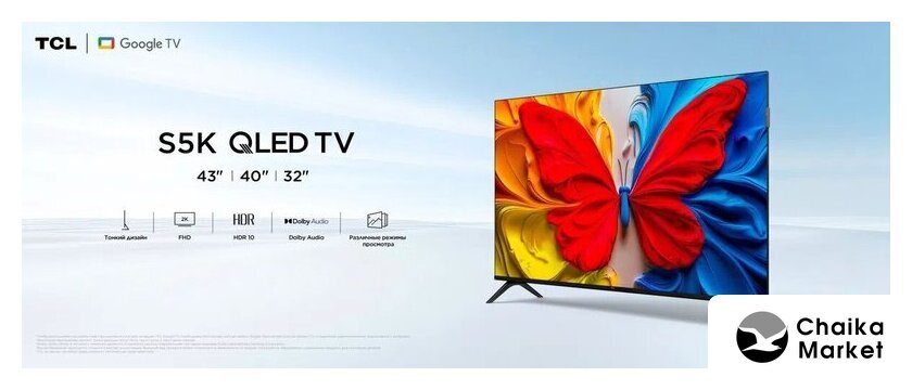 43" 3840x2160 (4K UHD), матрица VA, частота матрицы 60 Гц, Smart TV (Google TV), HDR10, HLG, AirPlay, Wi-Fi, смарт пульт