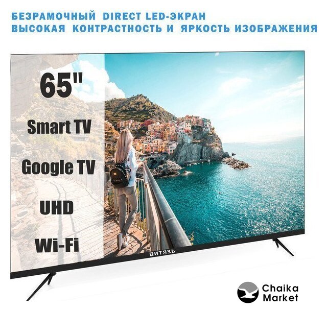65" 3840x2160 (4K UHD), матрица VA, частота матрицы 60 Гц, Smart TV (Samsung Tizen), HDR10, HDR10+, HLG, AirPlay, Wi-Fi, смарт пульт