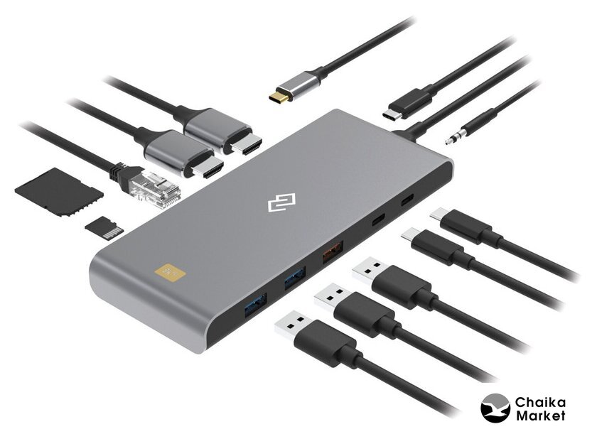 Все разъемы на адаптере | USB-A 3.2 Gen2 (10 Гбит/с), USB-A 3.2 Gen1 (5 Гбит/с), USB-C 3.2 Gen2 (10 Гбит/с), HDMI, RJ-45, USB-C (только для зарядки), 3.5 мм jack |