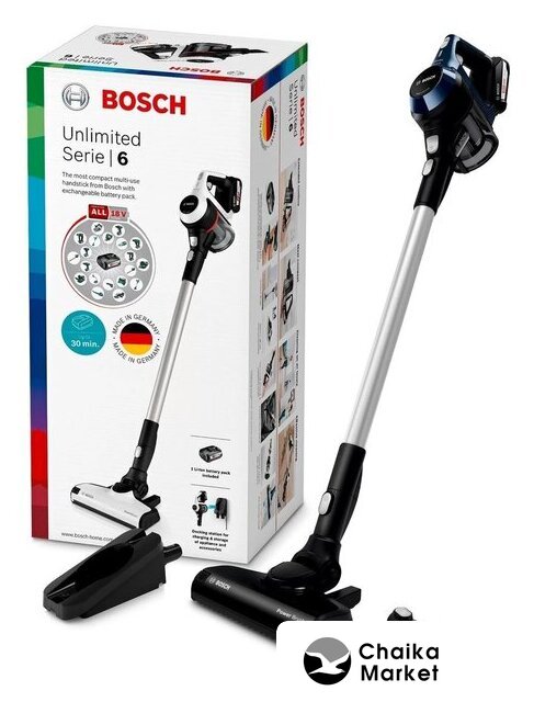 вертикальный 2-в-1, аккумулятор, мощность всасывания: 185 Вт, потребление: 550 Вт, регулировка мощности, турбощетка, док-станция с зарядкой