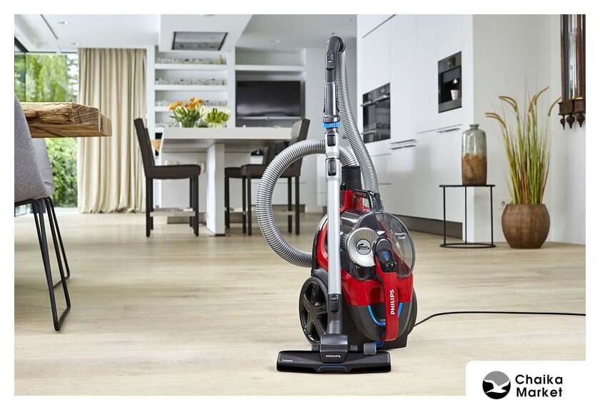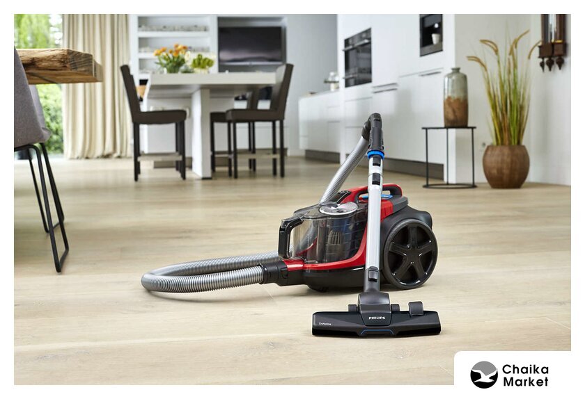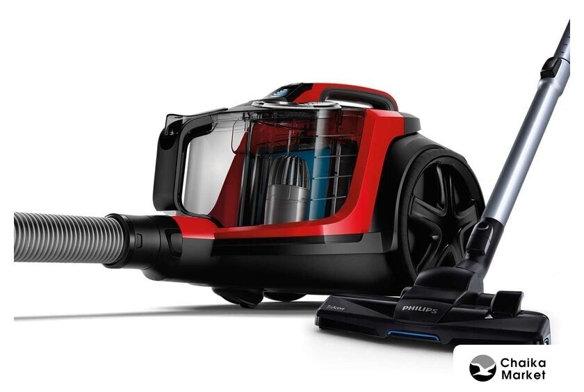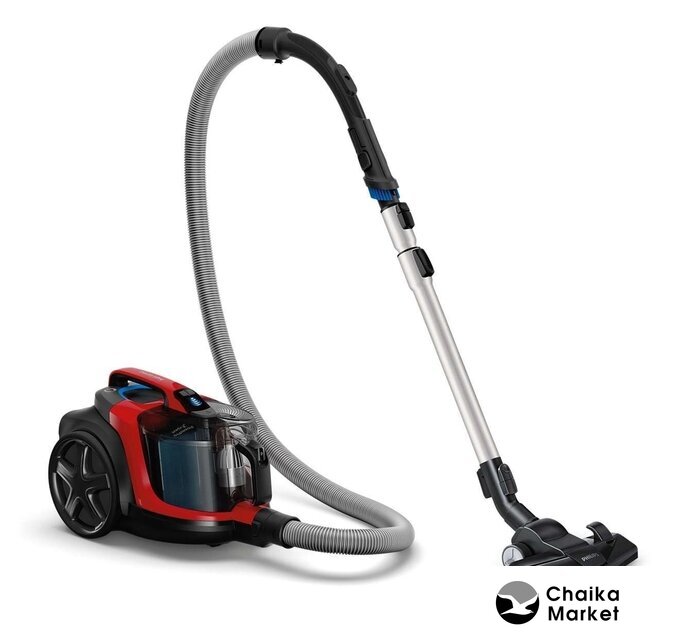 бытовой для сухой уборки, пылесборник: контейнер (циклонный), мощность всасывания: 380 Вт, потребление: 1800 Вт, труба: сталь, регулировка мощности на ручке, шум 87 дБ