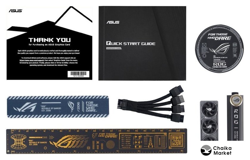 Комплект поставки | 1 x Speedsetup Manual1 x ROG Graphics Card Holder1 x ROG Velcro Hook & Loop1 x ROG Magnet1 x ROG Graphics Card Keycap1 x ROG PCB Ruler1 x Thank You Card1 x Adapter Cable (1 to 4) |