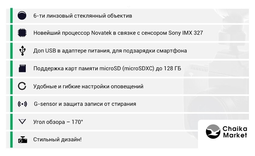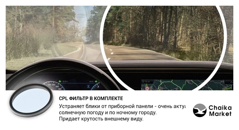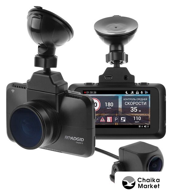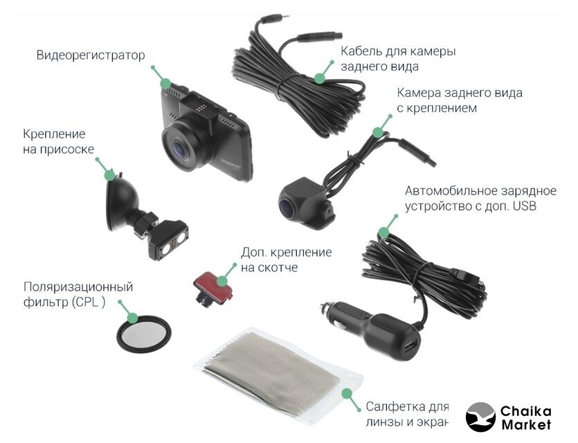 Комплектация | - видеорегистратор;- камера заднего вида с креплением;- кабель для камеры заднего вида;- поляризационный фильтр (CPL);- крепление на присоске;- доп. крепление на 3М скотче;- автомобильное зарядное устройство;- салфетка для линзы и экрана. |