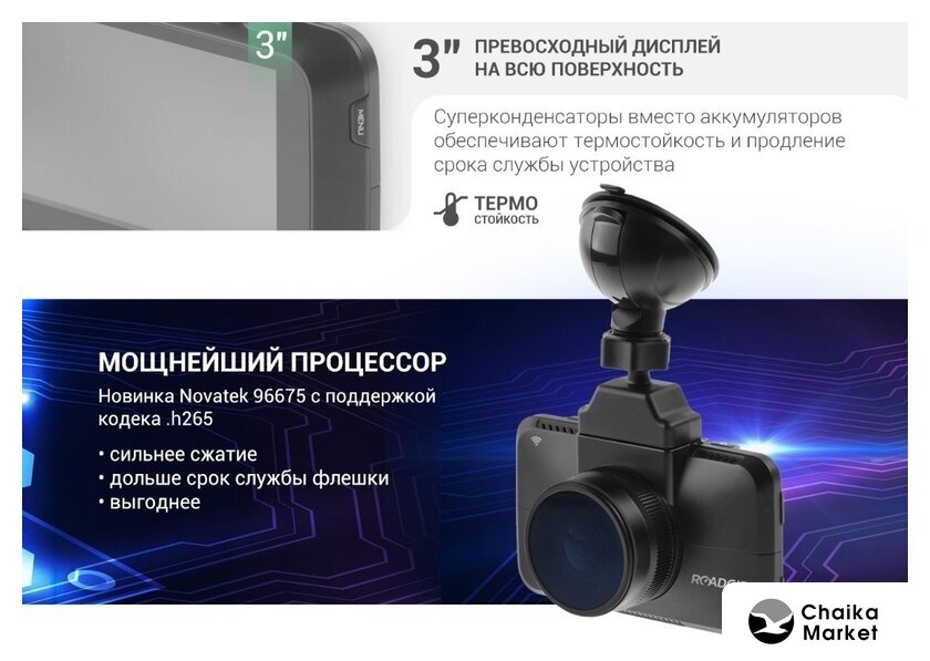 основная камера: 3.5 Мп 170°, видео 2560x1440 H.265, GPS, G-сенсор, экран 3"
