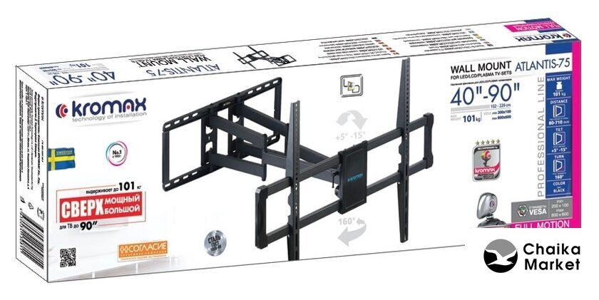настенный кронштейн для ЖК-телевизора 32-75", наклон 15°, поворот 160°, цвет черный