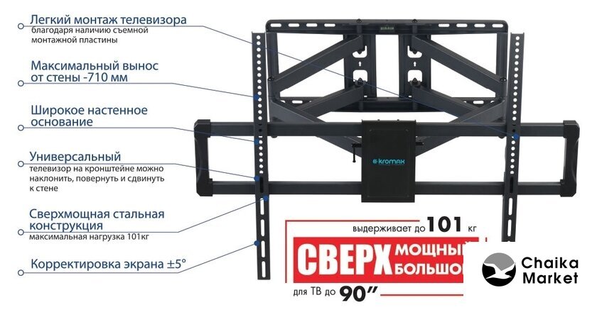 настенный кронштейн для ЖК-телевизора 30-70", наклон 15°, поворот 180°, цвет черный