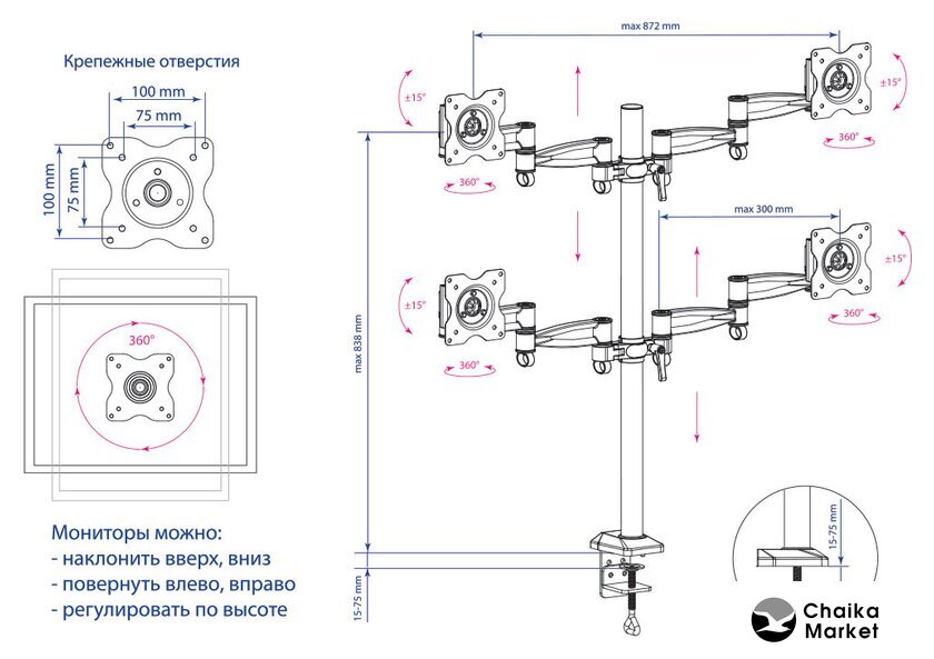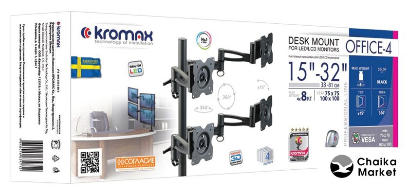 Максимальная нагрузка | 8 кг (по 8 на каждый монитор) |