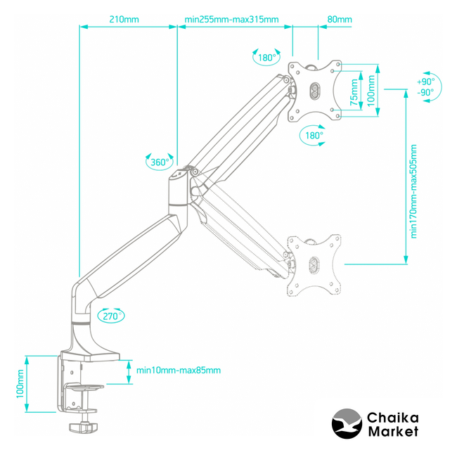 настольный кронштейн для ЖК-монитора 10-32", наклон 90°, поворот 360°, цвет черный
