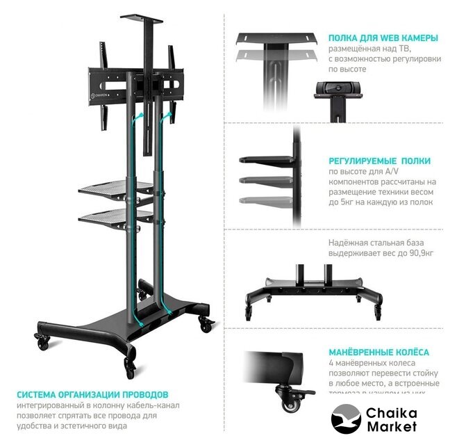для информационных панелей, 50-83", 1 монитор, напольный, поворотный, с регулировкой высоты, кабель-канал, с полкой, цвет черный