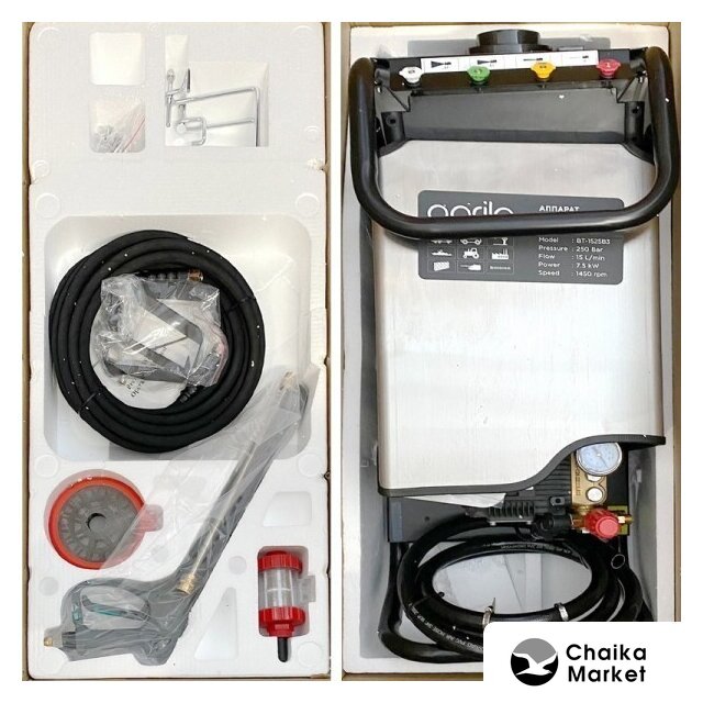 Комплектация | пистолет с термостойким удлинениемшланг высокого давления длиной 10 мшланг забора воды из ёмкости длиной 3 м фильтр тонкой очистки |