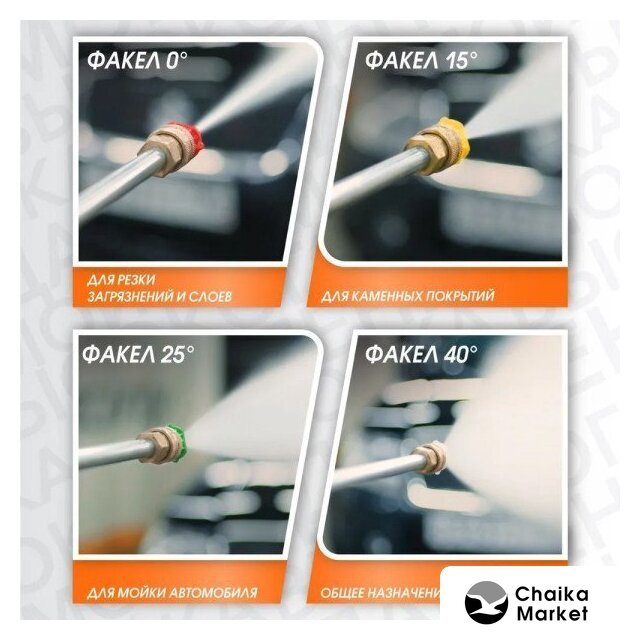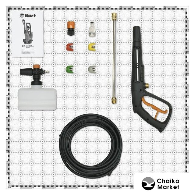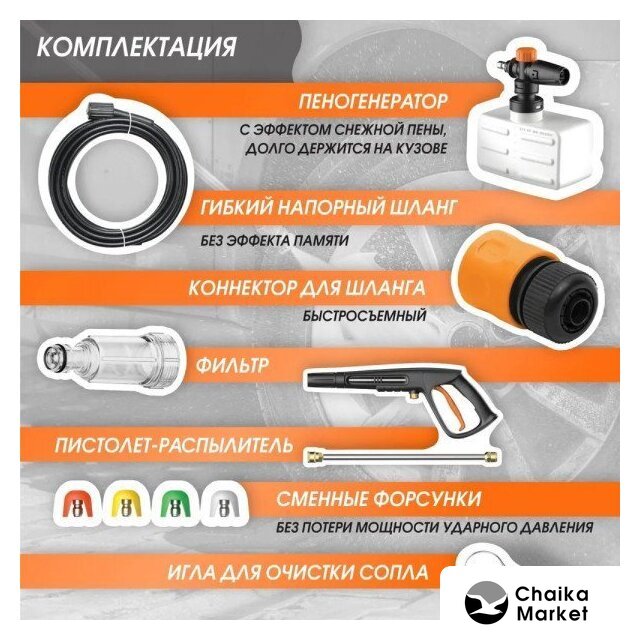 Комплектация | Пистолет-распылитель (1 шт)Напорный шланг (1 шт)Фильтр (1 шт)Сменные форсунки (4 шт)Пеногенератор (1 шт)Коннектор для шланга быстросъемный (1 шт)Игла для очистки сопла (1 шт) |