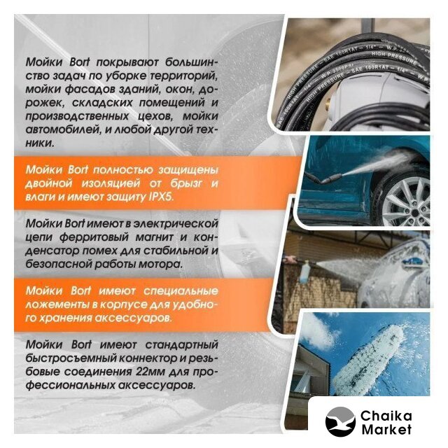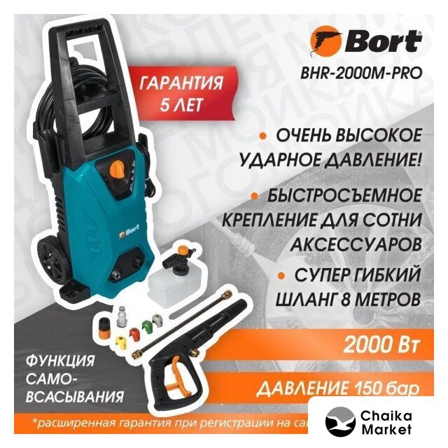 2200 Вт, 360 л/ч, максимальное рабочее давление: 165 Бар, длина шланга: 8 м