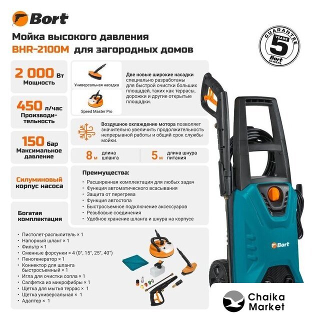 1600 Вт, 426 л/ч, максимальное рабочее давление: 135 Бар, длина шланга: 5 м