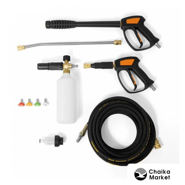 Комплектация | Мойка высокого давления - 1 шт.Профессиональный пистолет DPG350 550 мм - 1 шт.Металлическое копье из нержавеющей стали 455 мм - 1 шт.Короткий пистолет для пеногенератора - 1 шт.Армированный шланг высокого давления 10м - 1 шт.Профессиональный пеногенератор - 1 шт.Быстросъемные форсунки (0°/15°/25°/40°) - 4 шт.Фильтр тонкой очистки - 1 шт.Кабель подключения 275 мм - 1 шт.ИнструкцияКоробка |