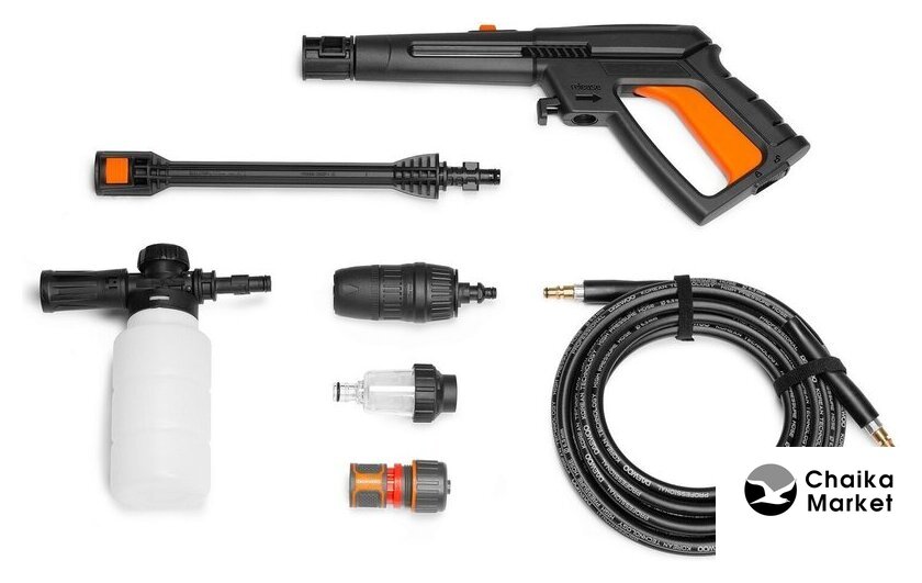 | Комплектация | - Мойка высокого давления - 1 шт.- Пистолет - 1 шт.- Шланг высокого давления - 1 шт.- Насадка удлинитель - 1 шт.- Насадка 4 в 1 - 1 шт.- Фильтр очистки воды - 1 шт.- Быстросъемный коннектор - 1 шт.- Пеногенератор - 1 шт.- Игла для прочистки форсунки - 1 шт.- Руководство по эксплуатации- Гарантийный талон- Коробка |