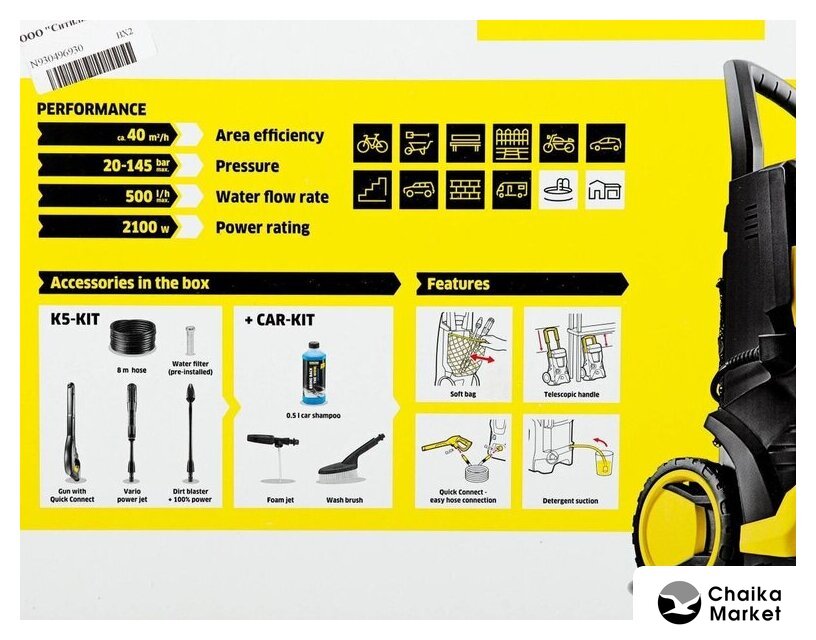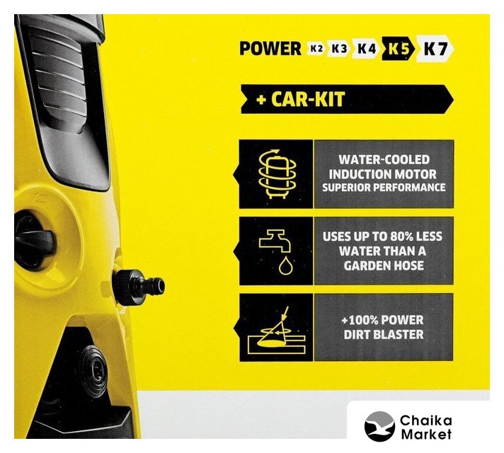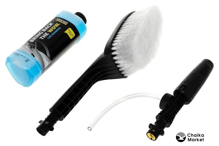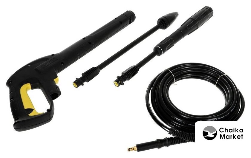 | Комплектация | - Комплект для мойки автомобиля (Car Kit): Щетка, пенное сопло, автомобильный шампунь, 0.5л- Пистолет: G 180 Q- Струйная трубка Vario Power- Грязевая фреза- Шланг высокого давления: 8 м- Адаптер для садового шланга A3/4" |
