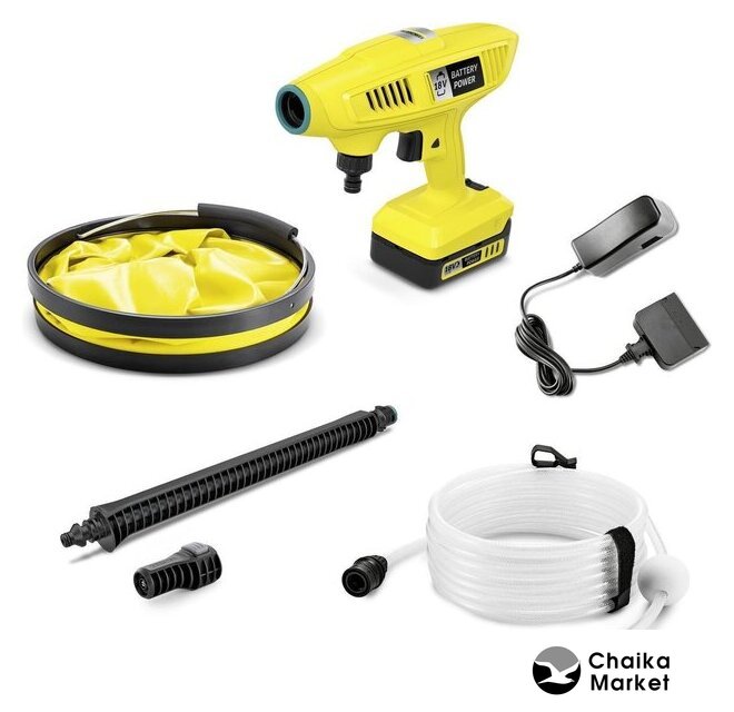 Комплектация | - Аккумулятор 18 В / 2,5 Ач Power Battery (1 шт.);- Стандартное зарядное устройство 18 В Battery Power (1 шт.);- Адаптер для подключения садового шланга A3/4";- Складной резервуар для воды;- Струйная насадка. |