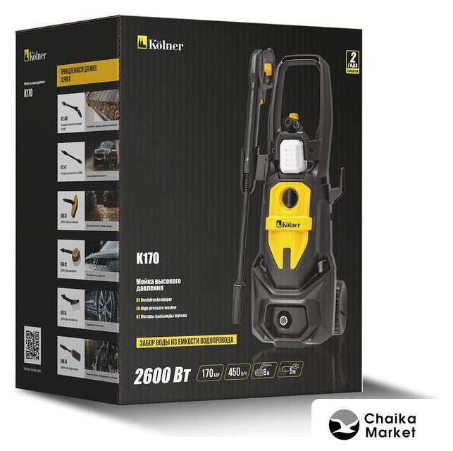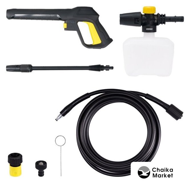 Комплектация | - мойка высокого давления, - шланг 8 м,- пистолет-распылитель, - пеногенератор, - быстросъём для шланга 3/4", - переходник с фильтром, - игла для очистки сопла пистолета, - руководство по эксплуатации. |