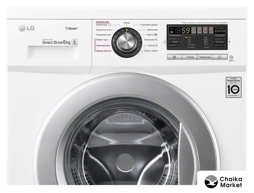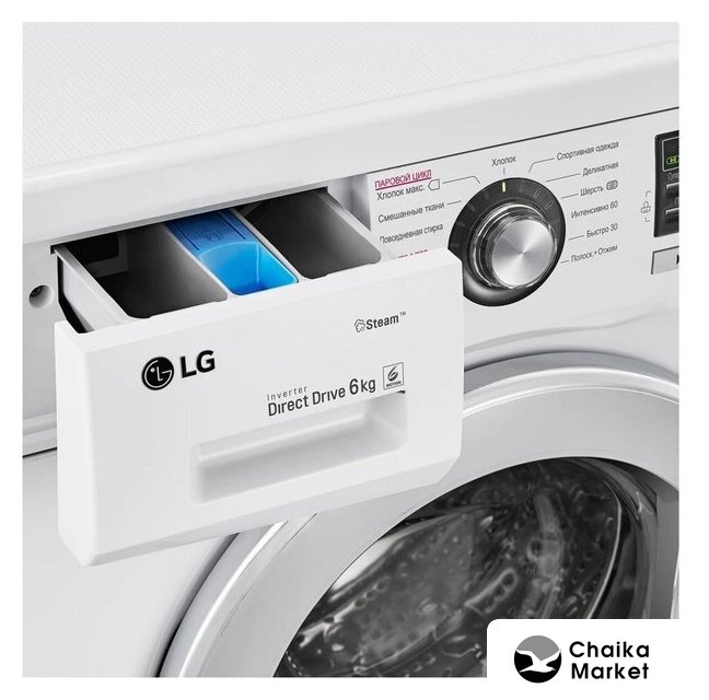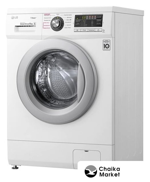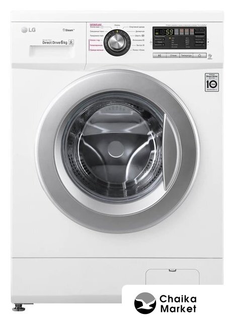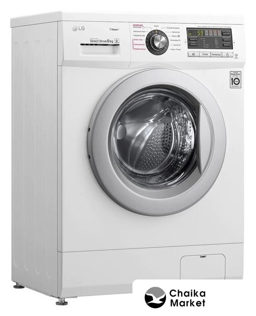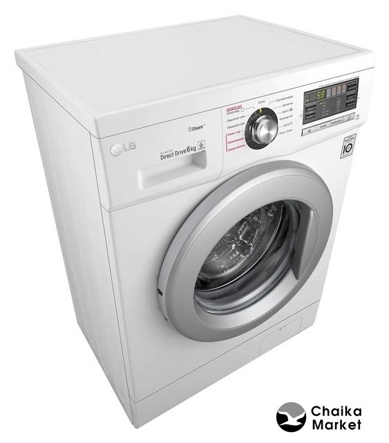 отдельностоящая, стиральная машина, с паром, загрузка до 6 кг, отжим 1200 об/мин, глубина 44 см (с люком 50 см), энергопотребление A, прямой привод, 10 программ, 6 Motion (LG)