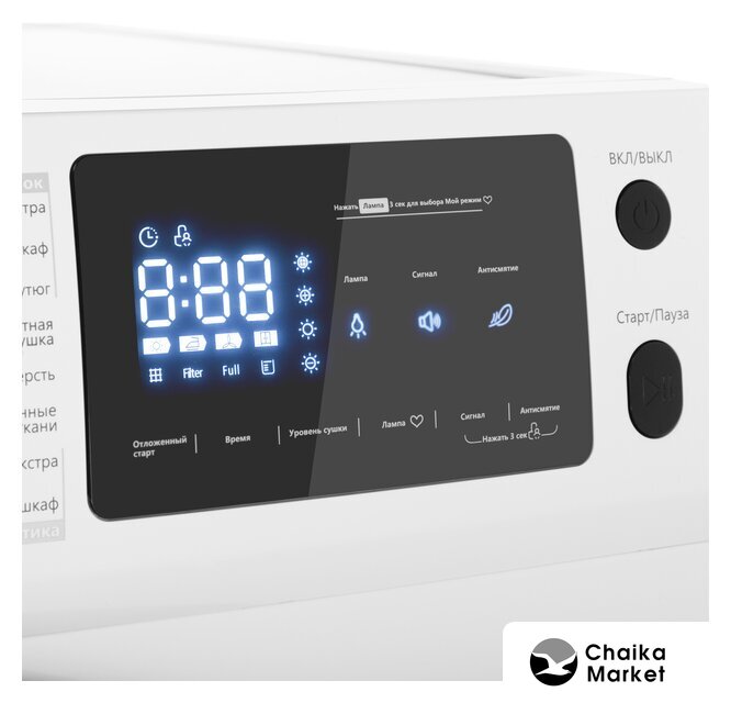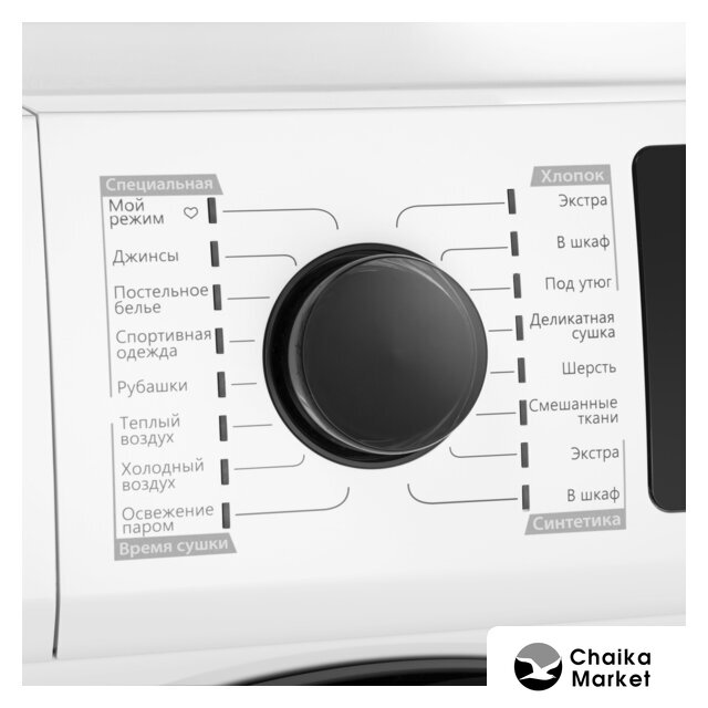 | Все программы | Хлопок экстраХлопок в шкафХлопок под утюгДеликатная сушкаШерстьСинтетика экстраСинтетика в шкафОсвежение паромХолодный воздухТеплый воздухРубашкиСпортивная одеждаПостельное бельеСмешанные тканиДжинсыМой режим |