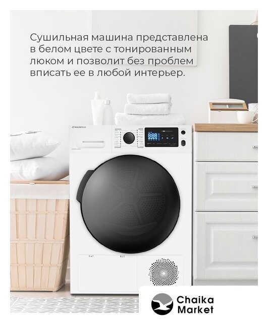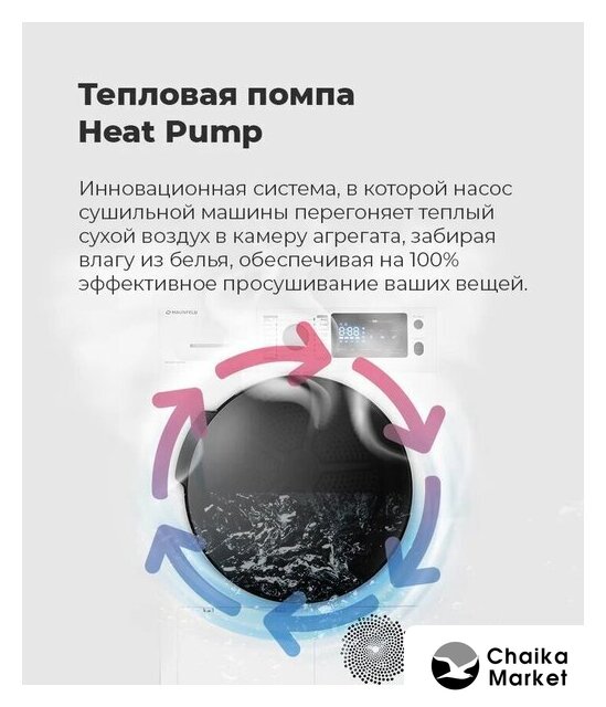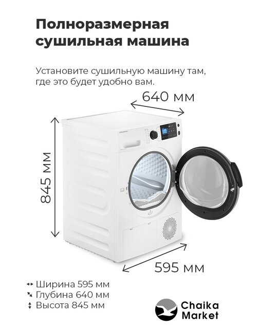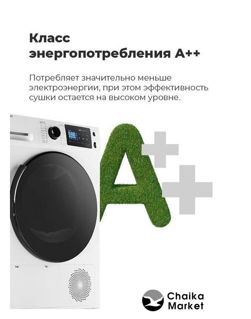 отдельностоящая, сушильная машина, сушка: конденсация с тепловым насосом, загрузка до 9 кг, глубина 61.5 см (с люком 66 см), энергопотребление A++, прямой привод, 14 программ