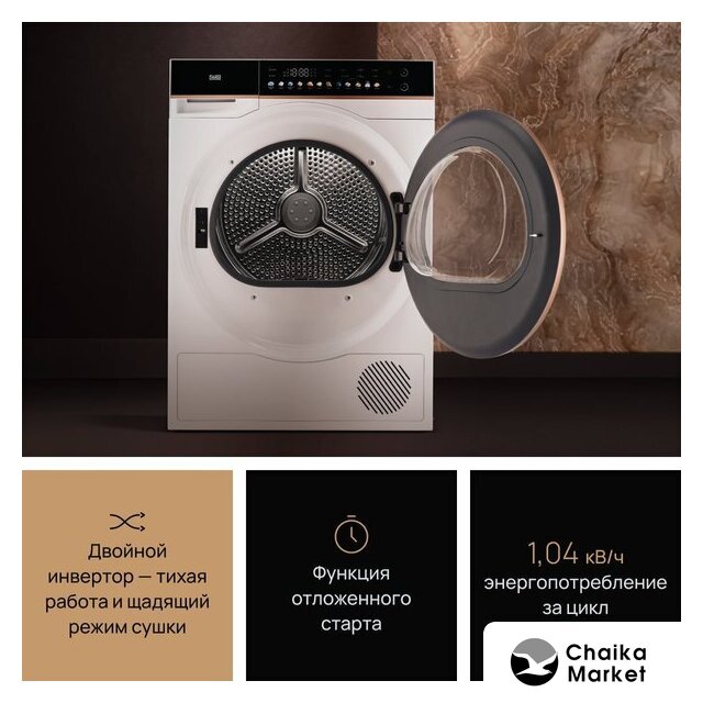 отдельностоящая, сушильная машина, сушка: конденсация с тепловым насосом, загрузка до 9 кг, глубина 62.5 см, энергопотребление A+++, 14 программ