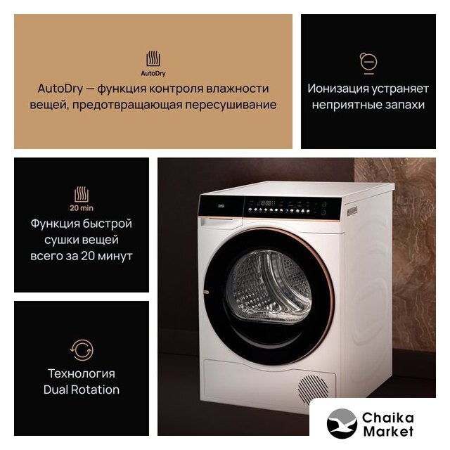 | Оригинальные функции | UV-луч — функция сушильной машины, которая активируется в конце постирочного цикла. Проходя через структуру ткани, ультрафиолет меняет структуру потенциально опасных микроорганизмов и предотвращает их дальнейшее размножение.Ионизация - генератор ионов создаёт заряженные частицы, которые освобождают бельё и одежду от неприятных запахов и пыли, а также обеспечивают бережную заботу о вещах. |