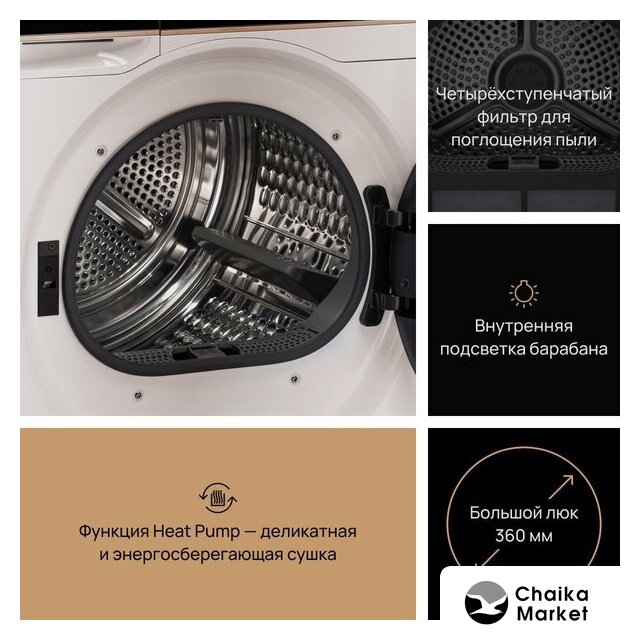 отдельностоящая, сушильная машина, сушка: конденсация с тепловым насосом, с паром, загрузка до 9 кг, глубина 64.4 см (с люком 66.2 см), энергопотребление A+++, 12 программ