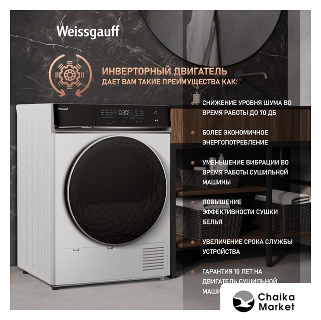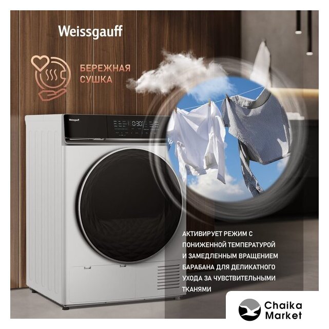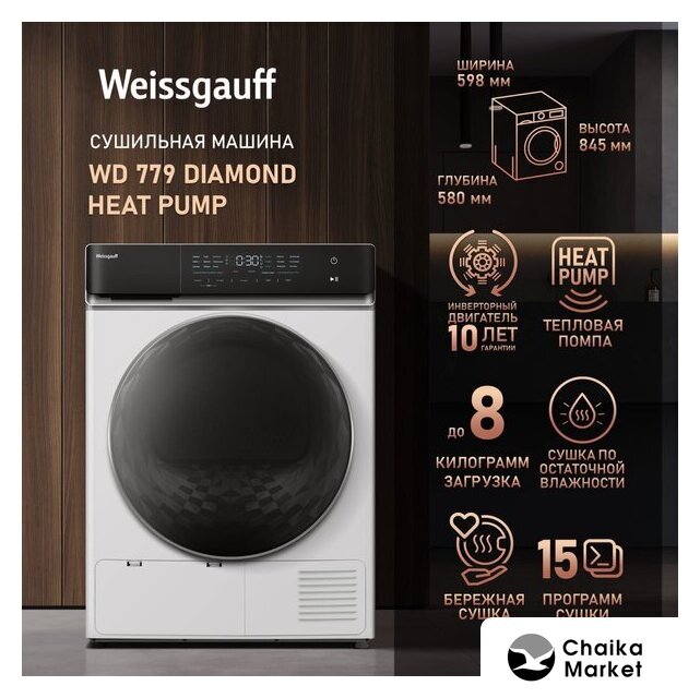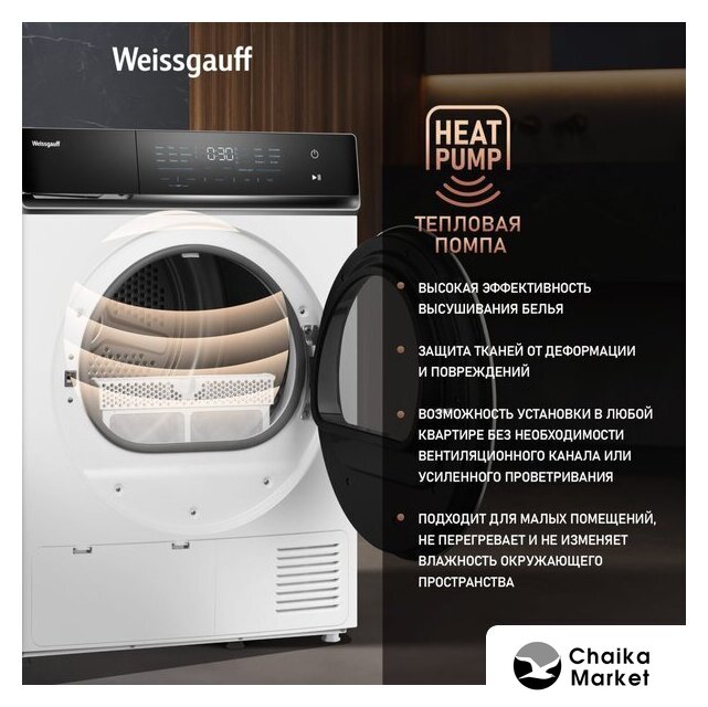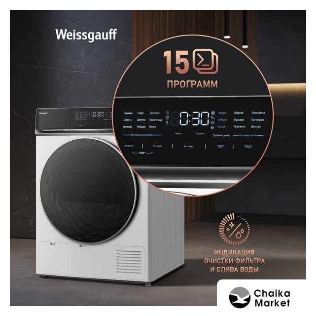 отдельностоящая, сушильная машина, сушка: конденсация с тепловым насосом, загрузка до 7 кг, глубина 61.3 см (с люком 66.5 см), энергопотребление A+, 15 программ