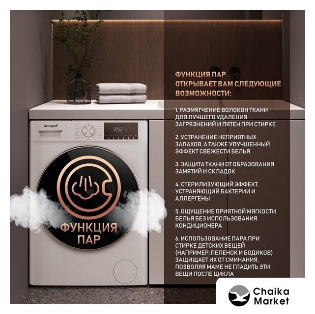отдельностоящая, стирально-сушильная машина, с паром, загрузка до 12 кг, отжим 1200 об/мин, глубина 61 см, энергопотребление A+++, 16 программ