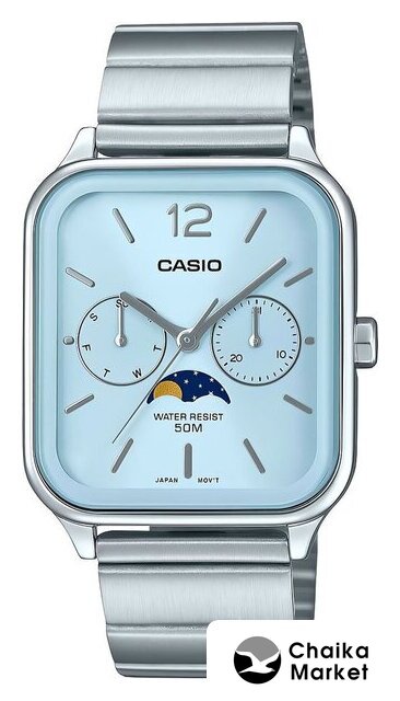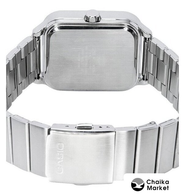 серебристый корпус, фиолетовый циферблат, серебристый браслет, металлический ремешок