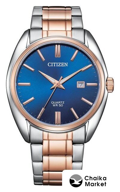 серебристый корпус, синий циферблат, серебристый браслет, металлический ремешок