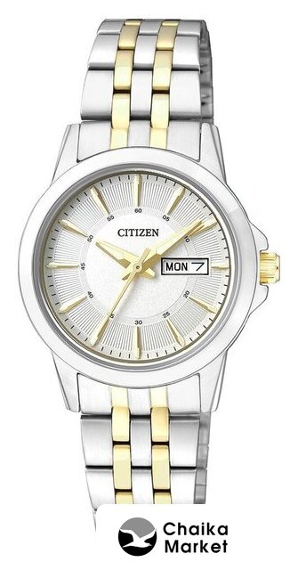 серебристый корпус, черный циферблат, золотистый/серебристый браслет, металлический ремешок