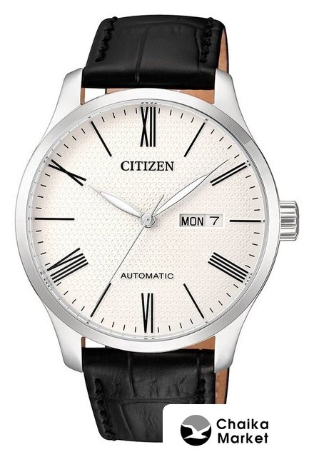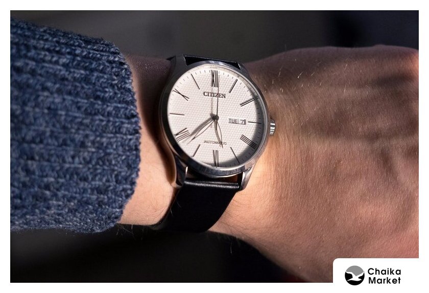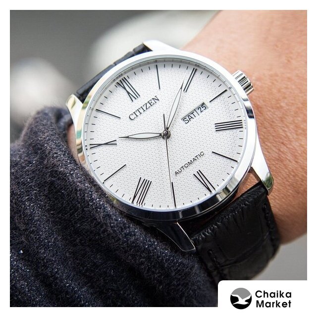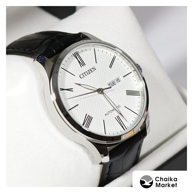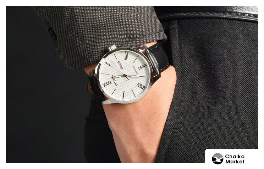 серебристый корпус, белый циферблат, черный браслет, кожаный ремешок