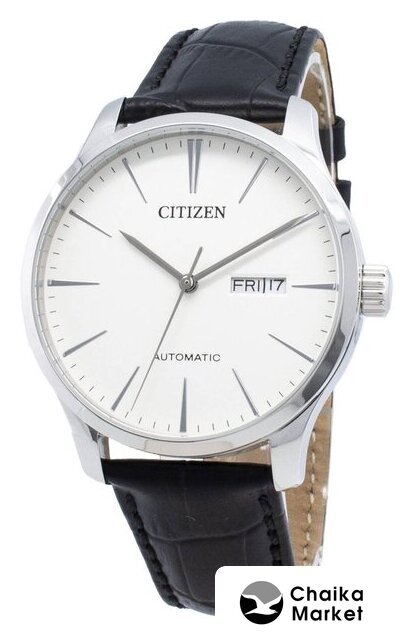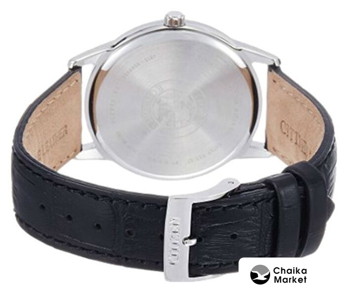 серебристый корпус, черный циферблат, черный браслет, кожаный ремешок