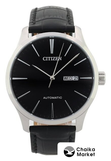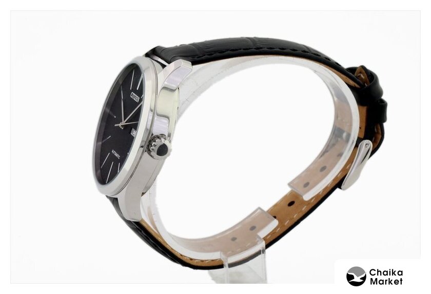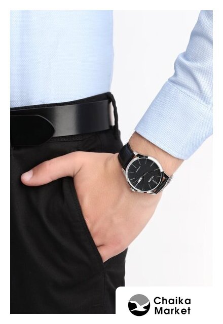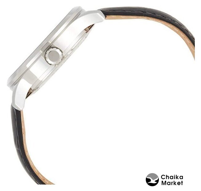 серебристый корпус, белый циферблат, черный браслет, кожаный ремешок