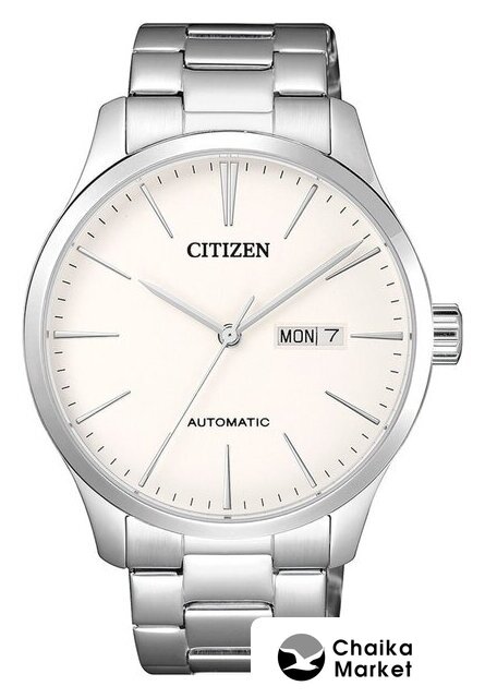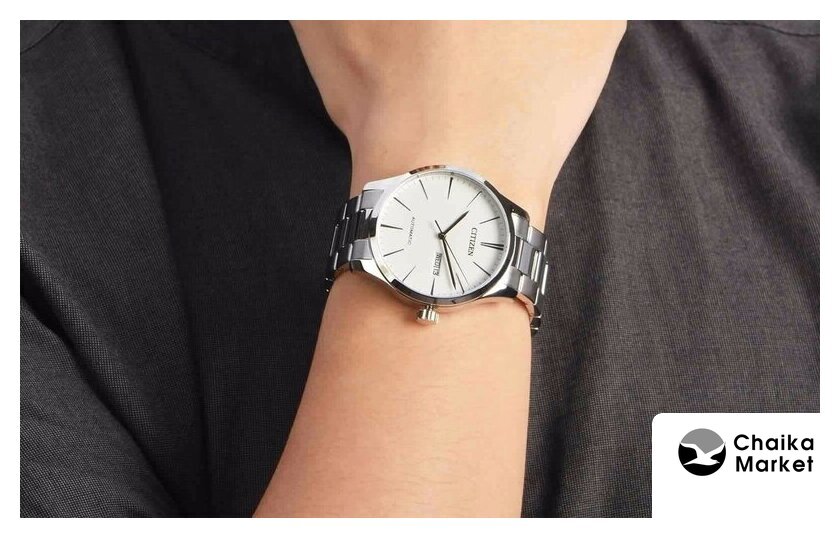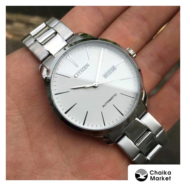 серебристый корпус, белый циферблат, серебристый браслет, металлический ремешок