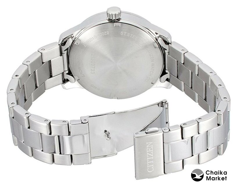 серебристый корпус, черный циферблат, серебристый браслет, металлический ремешок