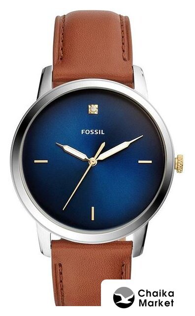 серебристый корпус, синий циферблат, коричневый браслет, кожаный ремешок