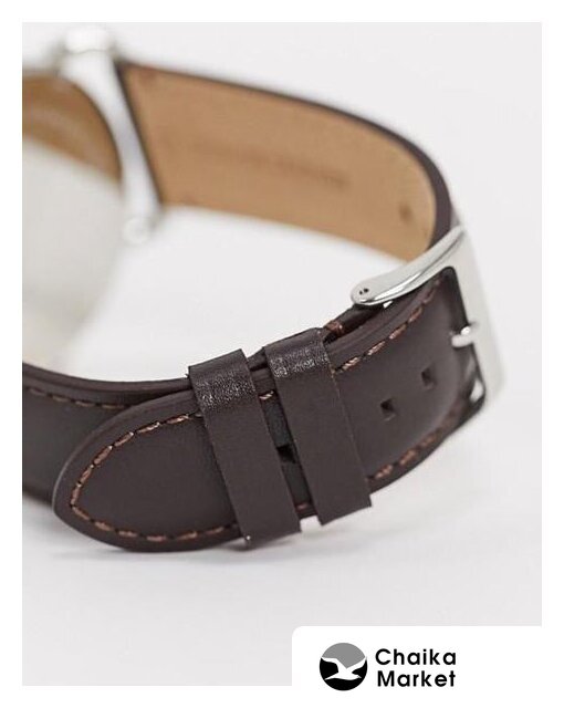 серебристый корпус, синий циферблат, коричневый браслет, кожаный ремешок
