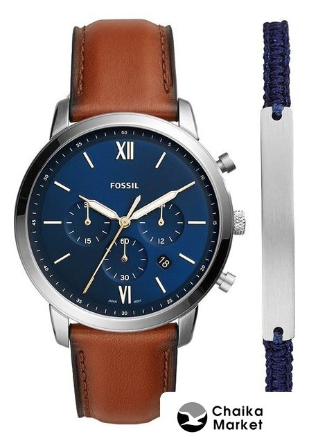 серебристый корпус, синий циферблат, коричневый браслет, кожаный ремешок