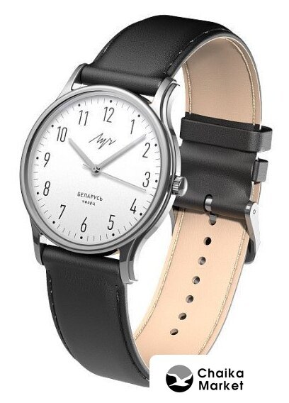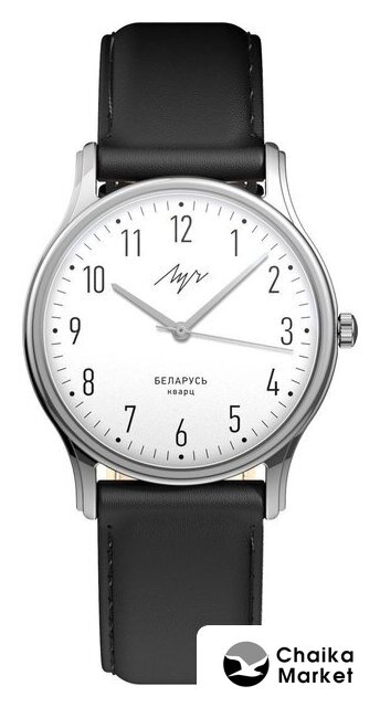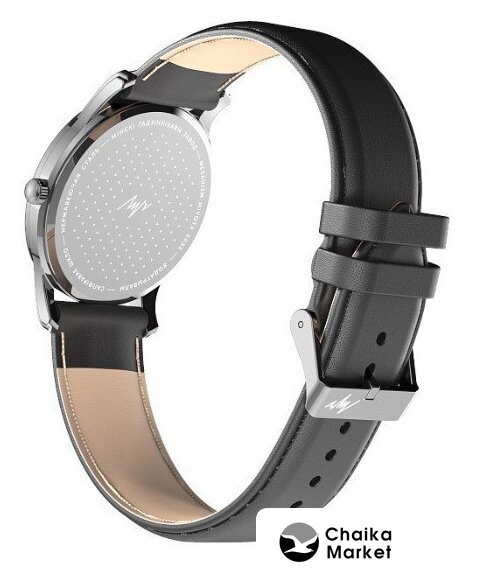 серебристый корпус, черный циферблат, черный браслет, кожаный ремешок