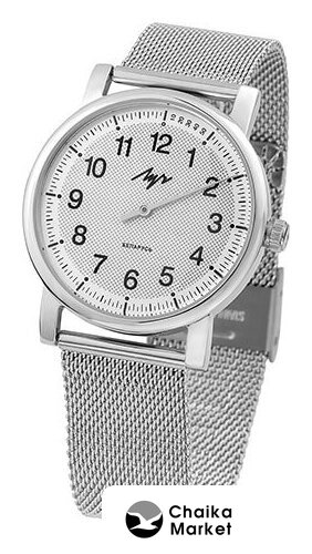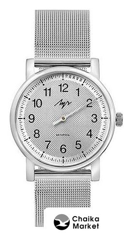 серебристый корпус, черный циферблат, серебристый браслет, миланский ремешок