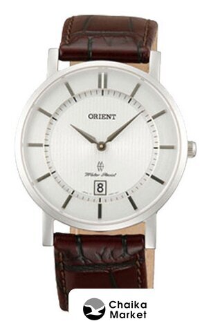 серебристый корпус, белый циферблат, коричневый браслет, кожаный ремешок
