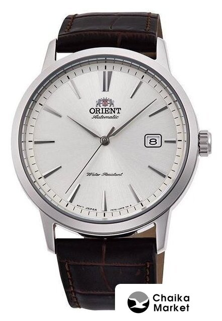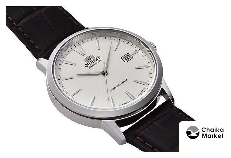 серебристый корпус, белый циферблат, коричневый браслет, кожаный ремешок