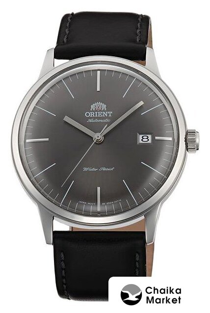 серебристый корпус, черный циферблат, кожаный ремешок