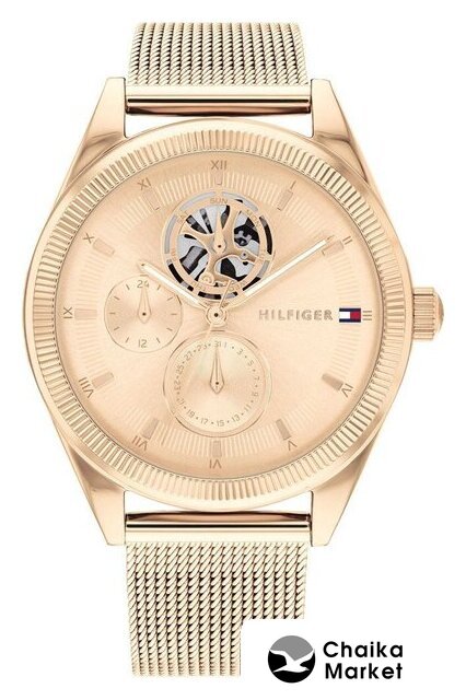 золотистый корпус, белый циферблат, золотистый/серебристый браслет, металлический ремешок