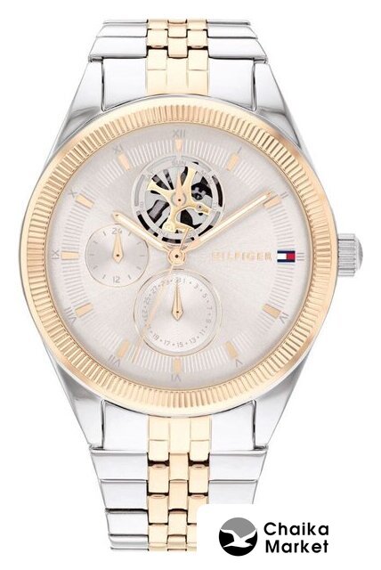 золотистый/серебристый корпус, белый циферблат, серебристый браслет, металлический ремешок