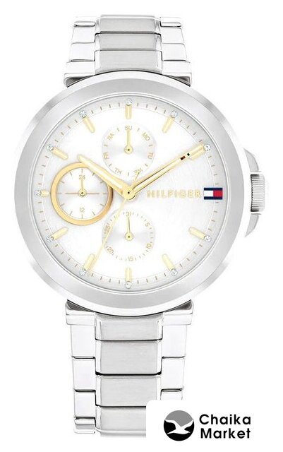 золотистый корпус, белый циферблат, золотистый браслет, металлический ремешок